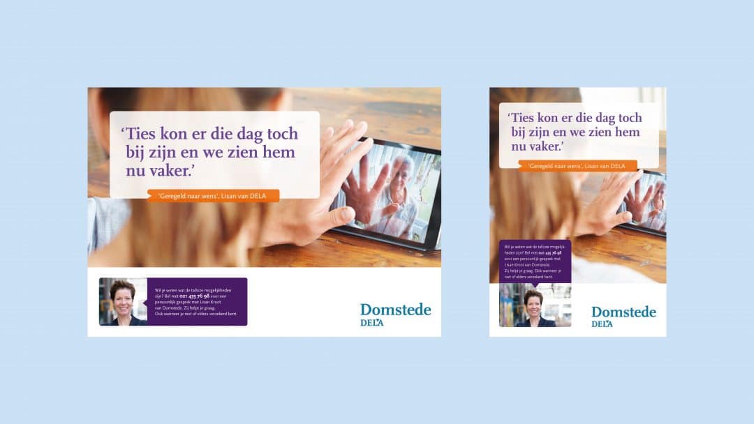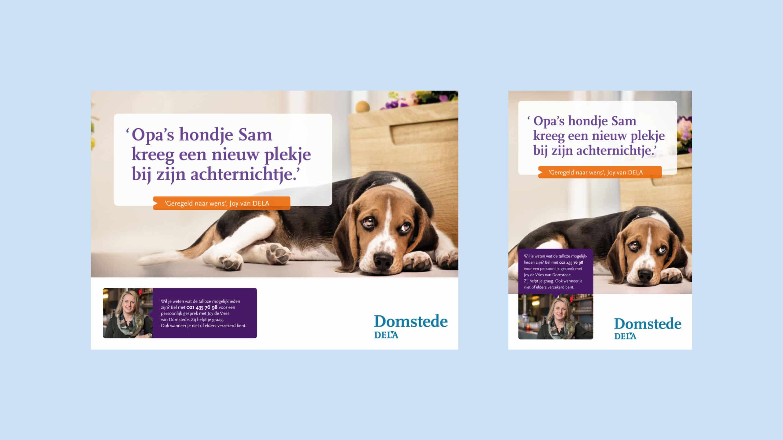 We ontwikkelden key visuals die inspireren en laten zien dat er heel veel mogelijk is.  Die we doorvertaald hebben naar een landelijke dagblad en social campagne. Omdat de uitvaartverzorgers van DELA lokaal een sterke verbondenheid en betrokkenheid kennen met de stad of dorp waarin zijn actief zijn hebben we ook een lokale campagne opgestart waarin we de lokale uitvaartverzorger voorstellen en mensen inspireren dat een afscheid moet passen bij wie de overledene was en wat de nabestaanden wensen. In beeld hebben we een huisdier van de overledene en een lange afstand familierelatie genomen. Beide situaties komen voort uit de ervaringen van uitvaartverzorgers.