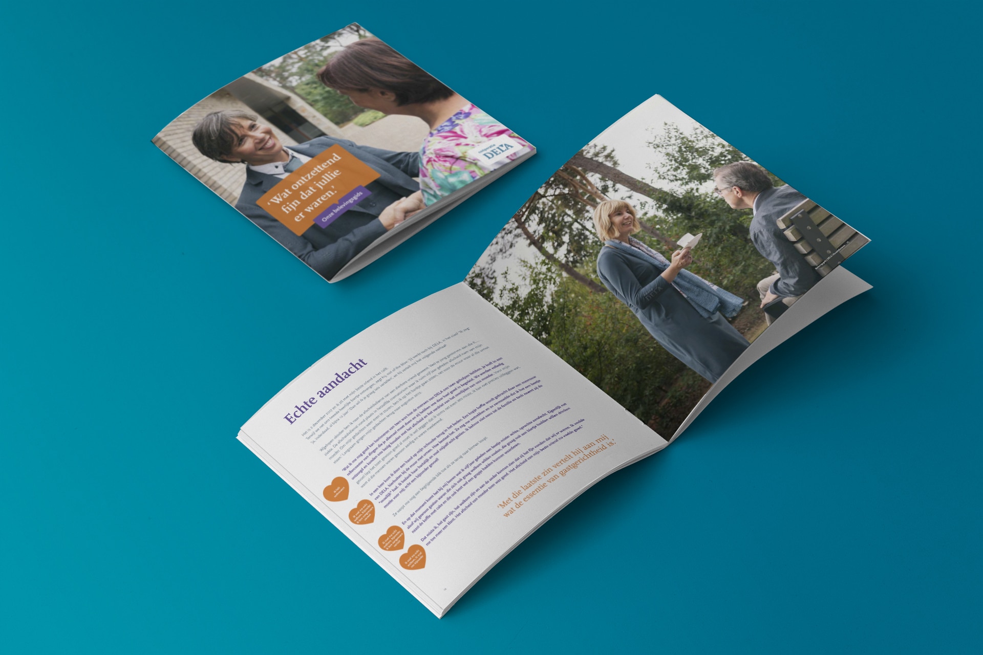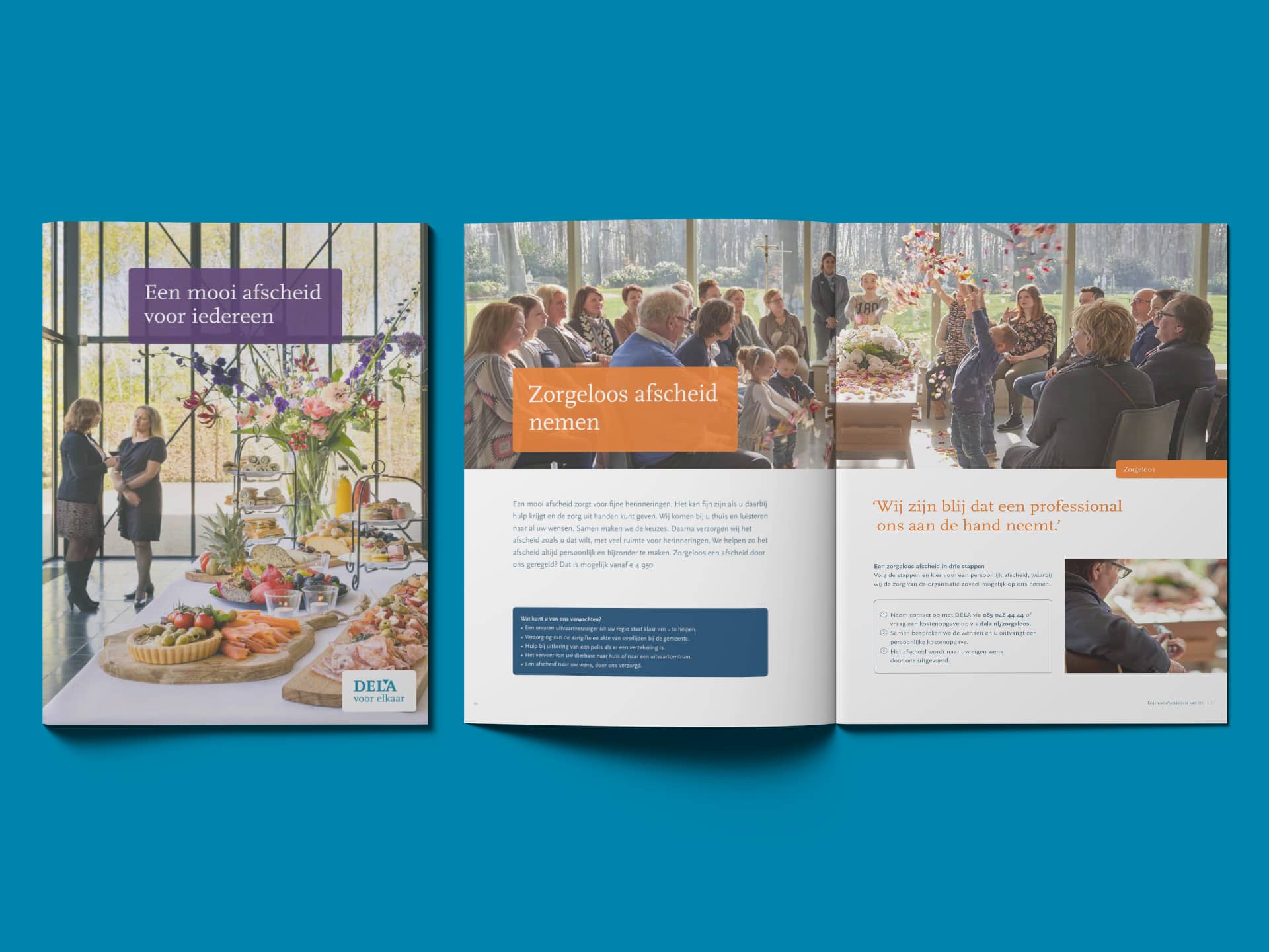 We ontwikkelden een brochure waarin de merkessentie van DELA meer inhoud krijgt. Daarbij lag de focus niet alleen op  ‘herinneringen’ in plaats van ‘afscheid’. Maar we hebben de focus ook gelegd op perspectiefverschillen. Bijvoorbeeld: ‘wat wij bij iedere uitvaart regelen’ versus ‘wat u van ons kunt verwachten’ We hebben bij de ontwikkeling gekeken hoe we de ontvanger centraal konden zetten en vanuit zijn of haar perspectief heel  ontvangersgericht te werk te gaan. Focus gebieden in het design waren hoge mate van dienstverlenendheid, warm en welkom in beeld en geformuleerd.