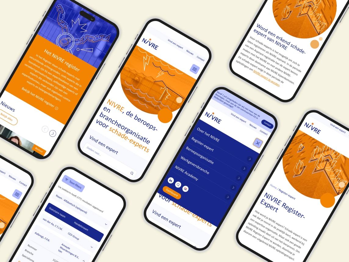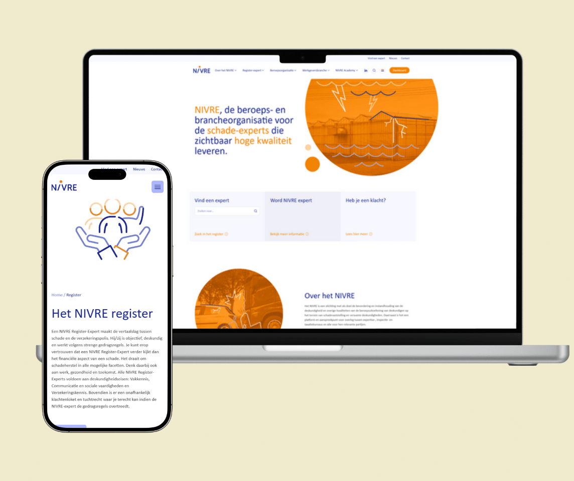 Het Nederlands Instituut Van Register Experts (NIVRE) is dé autoriteit in Nederland op het gebied van expertise en schadebehandeling. Als verbindende organisatie voor registerexperts wilde NIVRE haar digitale en merkmatige fundamenten vernieuwen om beter aan te sluiten bij de behoeften van haar leden, partners en stakeholders. Marck Agency kreeg de opdracht om deze transformatie te begeleiden, met als resultaat een nieuwe website, een vernieuwde merkidentiteit en krachtige visuele en inhoudelijke elementen.